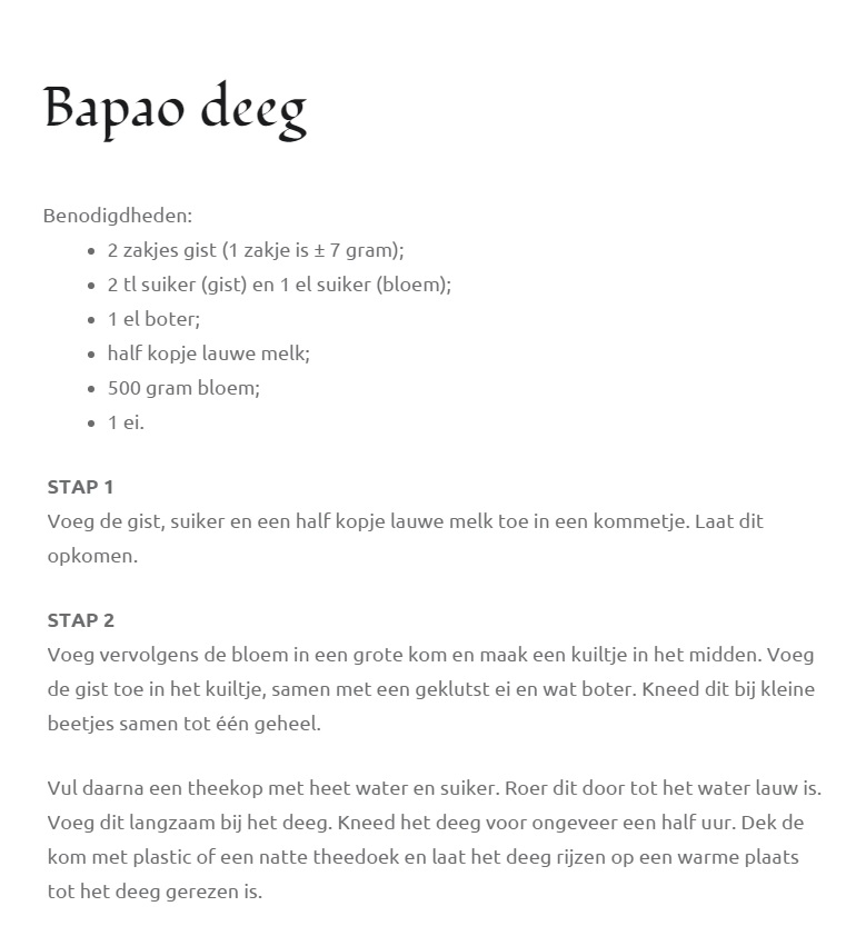 Aangezien het maken van bapao door de lange bereidingstijd van het deeg als een bewerkelijk recept ervaren kan worden, deel ik met jullie twee varianten. Onderstaand vind je de eenvoudige manier van het maken van het bapao deeg, maar doet zeker niet af van het originele recept. De vulling blijft tenslotte hetzelfde. Ben je benieuwd hoe je het deeg volledig zelf kan samenstellen? Lees dan het authentieke recept, waarin ik beschrijf welke ingrediënten oma gebruikte voor het deeg.